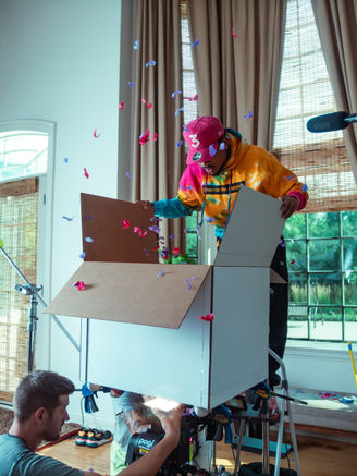 Opperate and build a larger then life, confetti shooting, cardboard box that would allow the camera to shoot through the bottom